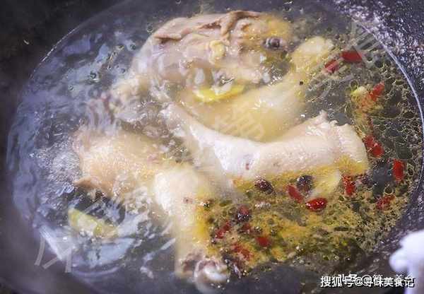 去腥,水烧开以后再煮一会儿,充分煮出鸡腿中的血水和杂质,把锅中的浮沫打干净,放入切好的葱、姜,撒入