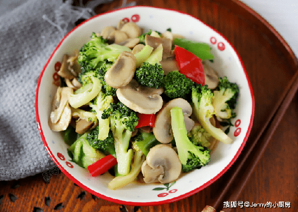 炒软后倒入西兰花翻炒均匀,再加入少许盐快炒几下,这道菜就做好了。口蘑特别鲜,不需要加过多的调味料。