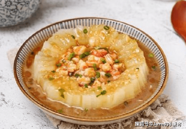 冬瓜表面清洗干净,再将外皮和内瓤去掉,切成薄片,放进盘内摆好,围成圆形,中间的位置留着放虾仁。