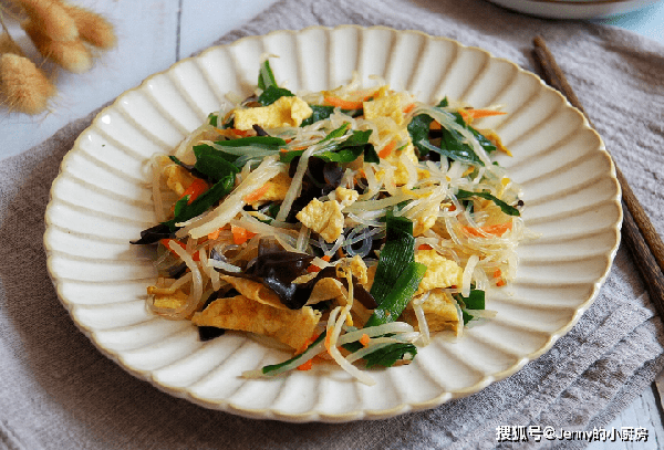 接着加少许油,倒入倒入胡萝卜、木耳翻炒,炒一分钟。再倒入韭菜根、豆芽翻炒,炒到豆芽微微打蔫。