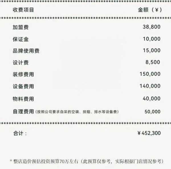 事实上,塔斯汀的加盟热度近日一增再增。在社交媒体上,不乏咨询塔斯汀加盟或分享加盟经验的帖子。锌刻度了解到,目前塔斯汀65㎡标准店的加盟费为38800元,但加上保证金、品牌使用费、设计费、装修费、设备费用和物料费用等,合计费用为452300元,而整店造价预估投资预算为70万左右。此外,“除了加盟费用,店长需要参与店长培训,还要带两名伙伴参与店员培训。”
