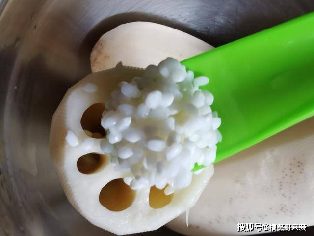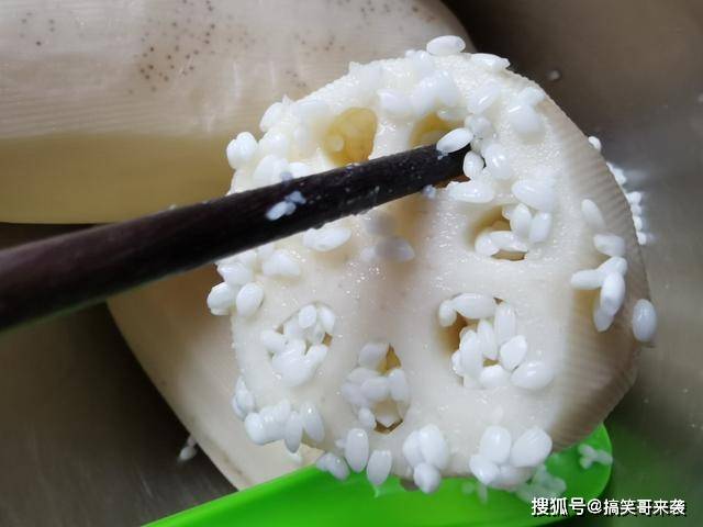 3、将莲藕放入糯米盆中,用勺子或其它工具,将糯米塞进莲藕孔洞中,挑莲藕的时候,太小孔洞的不要,避免塞不进去,最起码要比米粒大,九孔藕最好。