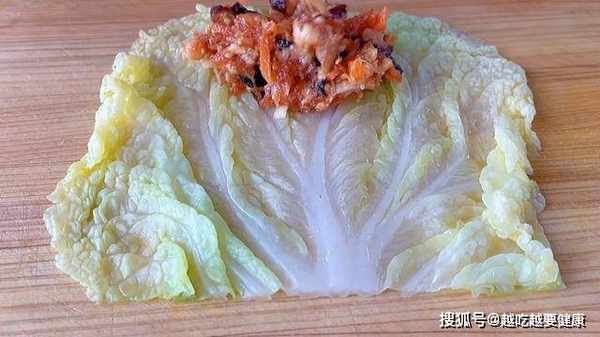 6、焯水过的白菜,切掉白菜梗,将肉馅放在白菜上卷起来。