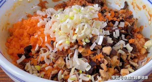 4、随后将切碎的胡萝卜、香菇、木耳、葱花,都放在猪肉末中搅匀。