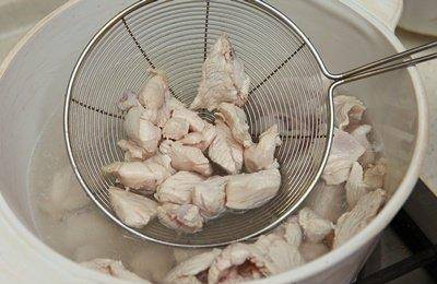 Tips:鸡肉汆烫后马上放入冷水中,可增加鸡肉的咬劲,也避免让鸡肉在后续煮的时候口感变柴。切鸡胸肉时,记得先切薄再切块,可让鸡肉更快吸附酱汁。