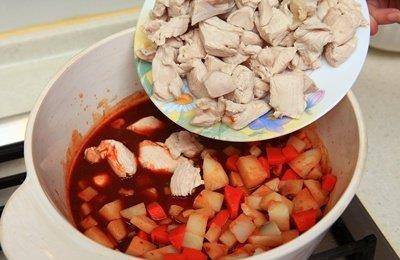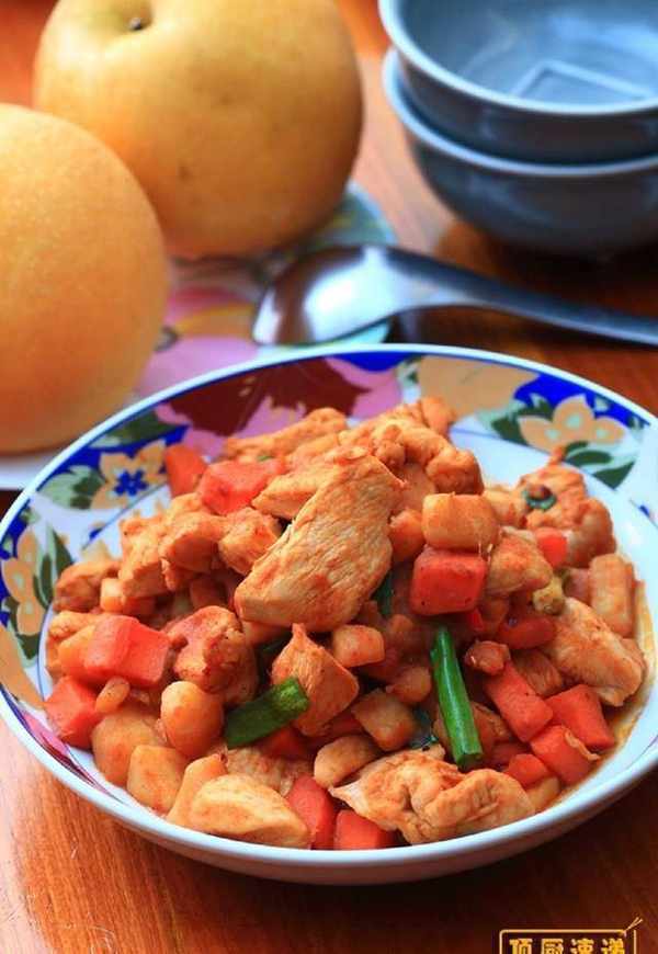 马铃薯、红萝卜蒸熟后切块。另起起锅开中小火,放入马铃薯块、红萝卜块及鸡肉块后,再倒入步骤1的酱汁炖煮。