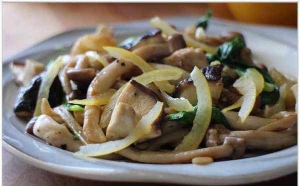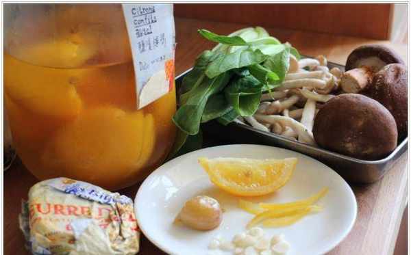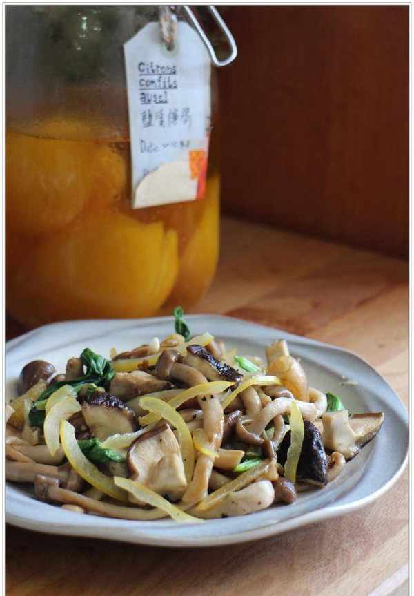 材料:鲜香菇和柳松菇、盐渍柠檬、油封蒜、杏仁、奶油