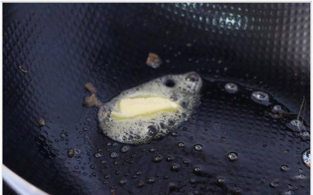 擦干锅子重新开火,放入无盐奶油立刻倒进刚刚炒过的菇,煎到有点褐色。