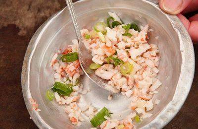 Step2:取一小盘子,放入切碎的虾肉、葱末、太白粉水,并倒入盐、鸡粉、白砂糖、白胡椒粉、香油及米酒少许,予以搅拌均匀。