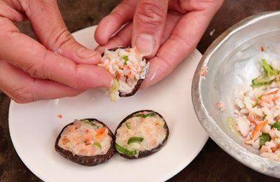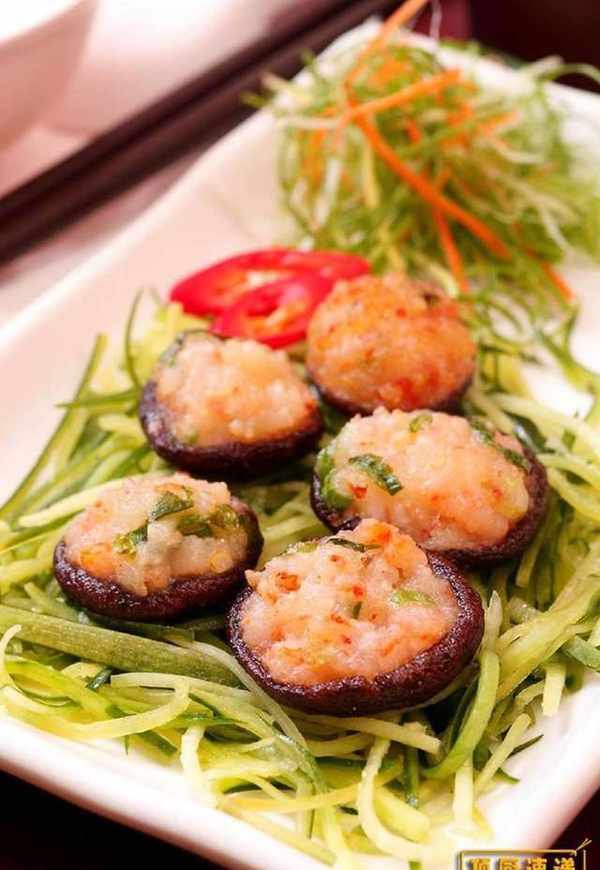 【香菇镶虾球】食材:熟草虾3只、干香菇5朵、小黄瓜半条、太白粉10克、葱半支。调味料:盐少许、鸡粉少许、白砂糖少许、白胡椒粉少许、香油少许、米酒少许