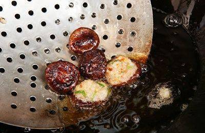 Step4:另起锅开大火,倒入淹过5朵香菇的油量,待油温为摄氏160度时,倒入镶好的香菇虾球,炸约1分钟,待香菇香气飘出即可取出。摆盘时先铺上小黄瓜丝,再放上香菇虾球即完成。※本食谱为2人份。