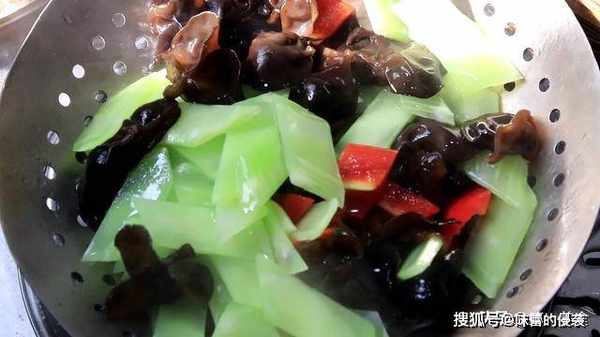 锅内加入清水,倒入少许植物油,水烧开以后,倒入准备好的木耳、莴笋和红椒,焯水30秒左右 食材断生以后即可倒出
