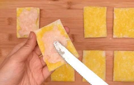 Step2:蛋黄打匀成蛋液,备用。方包、芝士各切半成8小片。Step3:在方包抹上蛋液,铺上薄薄的虾胶,再放芝士片,最后放上海虾。