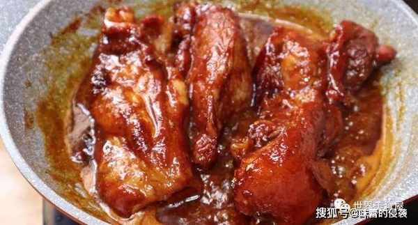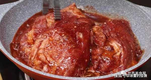 8、半小时后,汁水都渗入猪肉中,变成了酱黄色,味道很香。