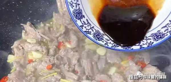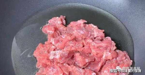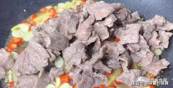 5、热锅放油,倒入牛肉,爆炒半分钟。
