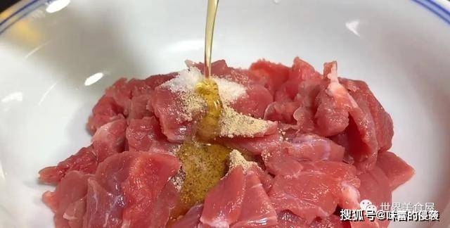 3、将葱姜汁倒在牛肉中腌制,另外加食盐、胡椒盐、生粉、花生油搅拌均匀。