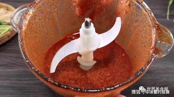 4、所有的配料搅碎之后,就得到上面的甜辣红色酱料。
