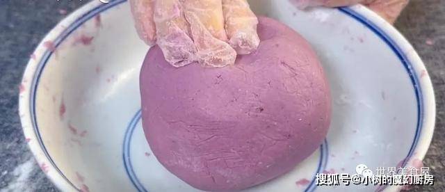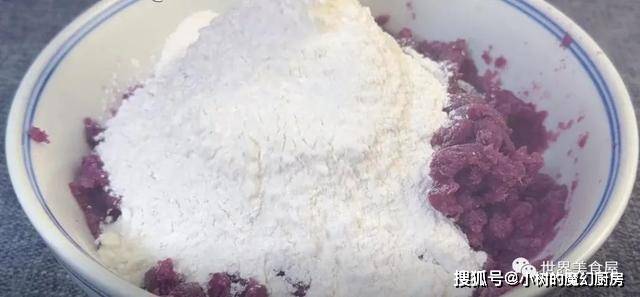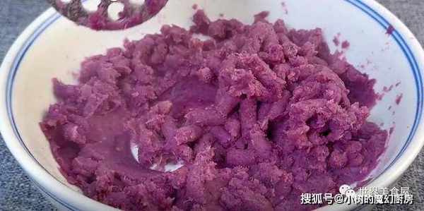 5、蒸熟的紫薯,加一勺砂糖,碾碎成泥。