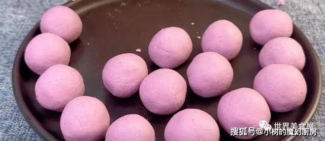 8、将紫薯面团分成小份,搓成小丸子造型,每一个拇指头大就可以了。