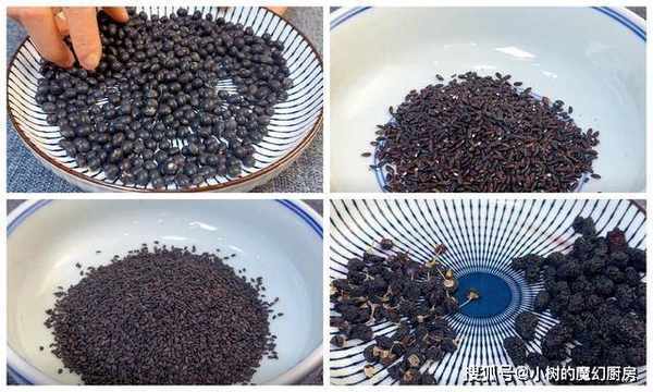 100克黑豆、50克黑米、50克黑芝麻、20黑枸杞、20黑桑葚、50红枣、1个紫薯、糯米粉