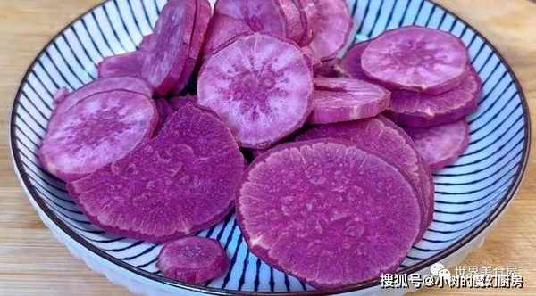 4、接下来,准备一个紫薯,将它去皮切片,上锅蒸熟。