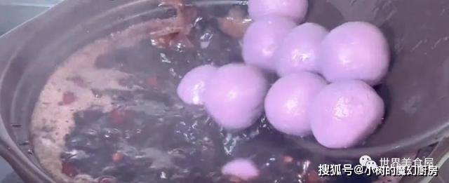 11、接下来,将煮熟的紫薯丸子,倒入砂锅中,混合所有的食材,继续煮5分钟。