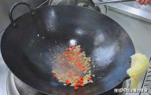 锅内烧油,油热以后,放入少许肉末翻炒,肉末炒香以后,放入小米椒圈继续翻炒,淋入一点料酒,加入食盐1克,白糖2克,生抽3克,老抽2克,放入生抽提一下鲜味,放入老抽提一下底色,加入一点清水,化开调料。