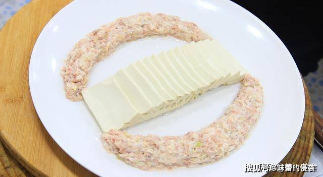 然后把搅拌好的肉末分成两半,分别摆在豆腐的两边,做成两座桥的造型,过桥豆腐就有那么个意思了。