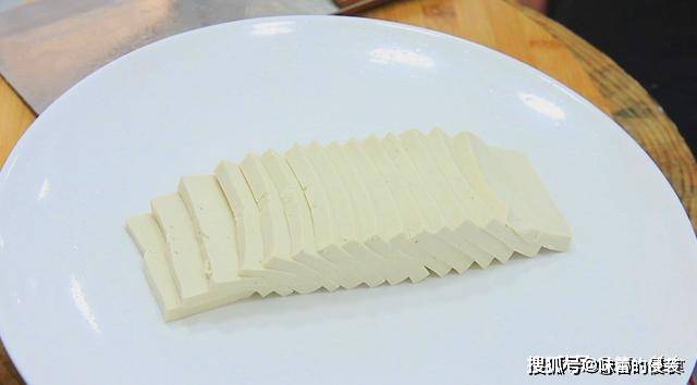 豆腐300克,豆腐切成0.5厘米厚的块,放在盘子中间。