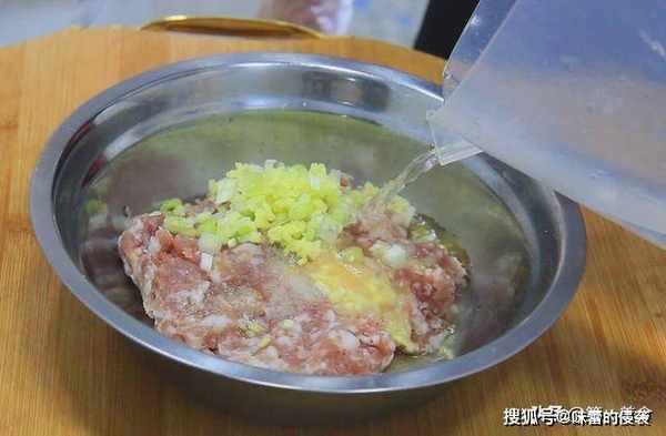 加入清水肉馅更嫩,加入胡椒粉能够减少肉类的腥味,给肉末增香,用手顺着一个方向搅拌摔打上劲。