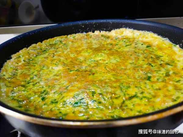 5、起锅烧油,油比平常炒菜时要多一些,避免粘锅,等油温6-7成热时,倒入香椿鸡蛋糊,保持中小火慢煎,随着时间的推移,鸡蛋饼会结块定型,是时候该翻面了。