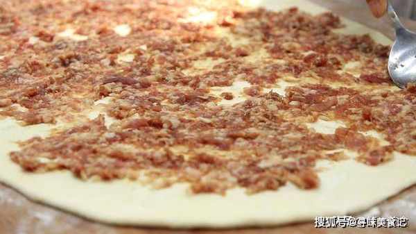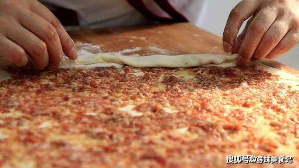 然后,把调好的肉馅均匀的涂抹在面皮上面,尽量的让肉馅薄厚一致。