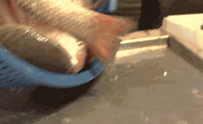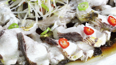 梭鱼去鳞、去腮,剪开鱼颌骨,将腮、内脏等用长筷卷出;取出内脏后,将梭鱼切成1至1.5公分的宽度,断骨不断腹;将鱼肉进行腌制,加入葱、姜、花椒、广东米酒、胡椒粉和适量水没过鱼身,腌15到20分钟去腥提鲜。