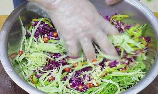 2、撒入一些食盐拌匀,用保鲜膜封住腌制10分钟,出紫甘蓝中的水分,以免拌的过程中出水。同时还能去除青涩味,便于后期吸收调料入味。黄瓜半根切成细丝,香菜只用杆切成段,青椒切成丝,几个小米椒切成细圈。