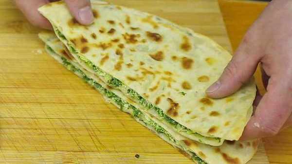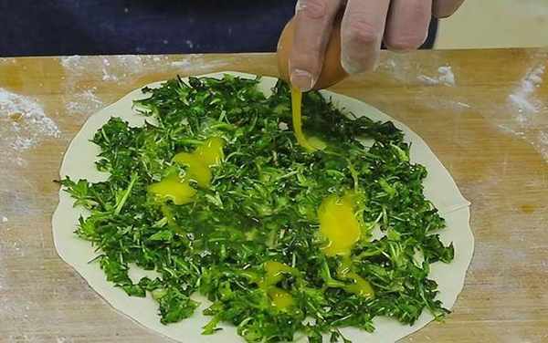 4、擀好以后铺上一层荠菜,磕上一个母鸡蛋,再拿个面片往上一盖,用个圆盘轧一圈,饼坯圆溜溜,严丝合缝,丝毫不用担心流汁。