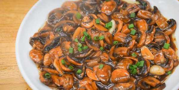 4、锅内烧油,放入蒜片爆香,葱姜太压味,不要放。把口蘑倒入锅中,大火爆炒,加入蚝油、老抽上色,酱料都是咸的,不需要放盐。大火爆出香味,沿锅边淋入一点清水,方便入味,芶入少许水淀粉把汤汁收浓,就可以出锅了。