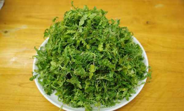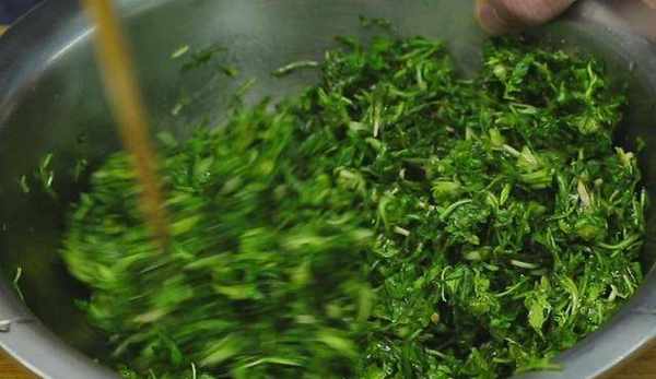 2、荠菜洗干净剁碎,多加点盐拌匀腌一会,水,去去土腥味,腌好以后把里面的水挤干净,稍微加一点鸡粉,不用再放其他调料,吃得是荠菜本身的鲜味。再多淋点油,给它裹一层油膜。