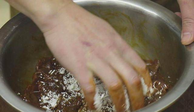 2、加盐、胡椒粉、生抽、老抽上色,蚝油提鲜,顺着一个方向先把调料打到猪肝里面,再捏进去一小撮淀粉锁住水分,放在一边,腌上10分钟。