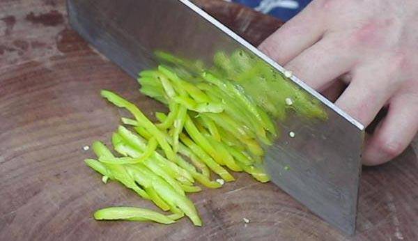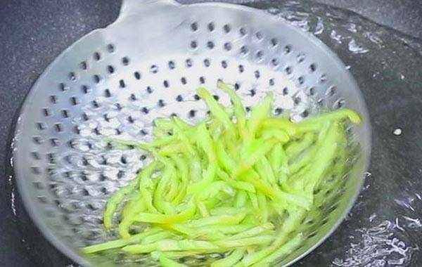 3、配菜主要用来搭配颜色,可以随便选自己喜欢的,烧半锅开水,把青椒丝放进去稍微烫一下,生青椒吃着有股辛辣味,三五秒钟就可以了,捞出来备用。