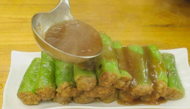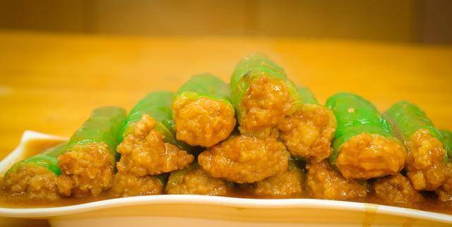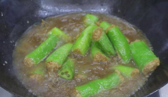 7、把青椒酿肉放进去,盖上盖转小火慢慢煨,大概煨个五六分钟,青椒酿成熟、入味以后就能出锅了。整整齐齐码盘里。剩余的汁大火熬开,芶进去点水淀粉收浓,咕嘟冒泡以后淋点明油,然后起锅往青椒酿肉上一浇,肉香青椒香合二为一。