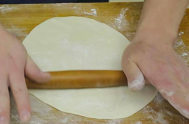 3、案板上撒上面粉,把饧好的面取出来,稍微揉几下,搓条、揪面剂子、擀面片子,尽量中间厚、两边薄、省的露馅。