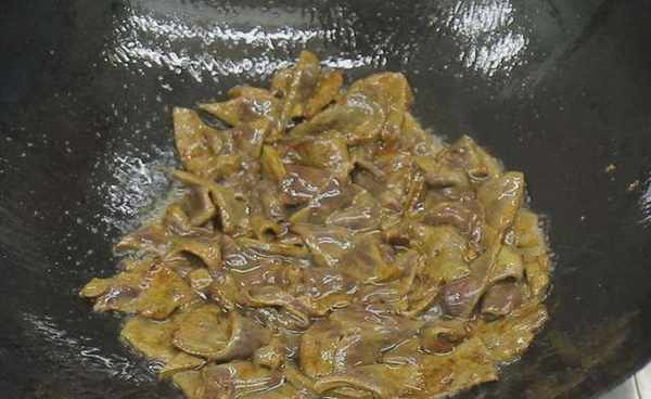 5、炒的时候火要猛一点,前后也就十来秒的时间,猪肝完全定型,基本上就熟了,这个时候把韭菜放进去,韭菜本身特别好熟,随便翻几下就行了,然后备好的碗料往里一淋,翻炒收紧以后淋上明油,出锅。