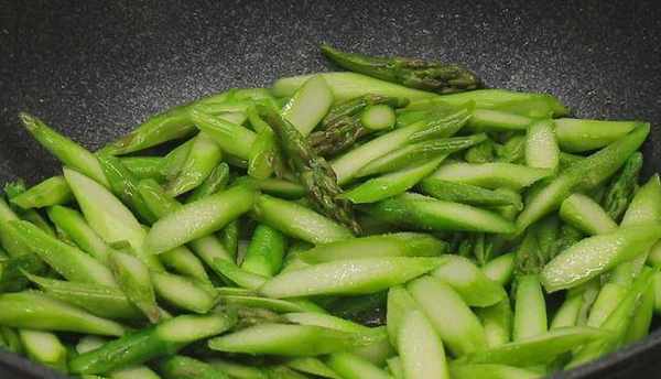 3、锅内再烧油,油烧热以后倒入芦笋,用中大火快速的炒断生,然后加入食盐、白糖、鸡粉调味,芦笋的鲜味很足,调味时不要放太多调料。