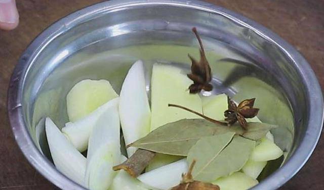 4、再切点葱段、姜片放碗里,加进去一节桂皮、两片香叶、一块良姜、俩八角备用。