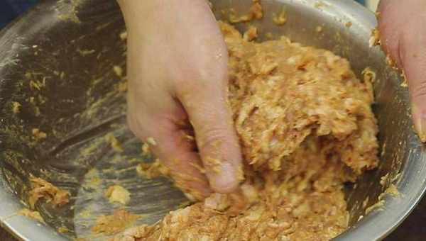 2、分次往里面倒葱姜水,每一次都要搅拌至完全吸收,一共加了三回,吸饱水分的肉馅吃着才弹才嫩,颜色淡了稍微淋点老抽,再放点小磨香油,锁水又增香,抓进去一把淀粉,继续搅拌摔打,直至肉馅管拉丝,抓起来不掉落就可以了。