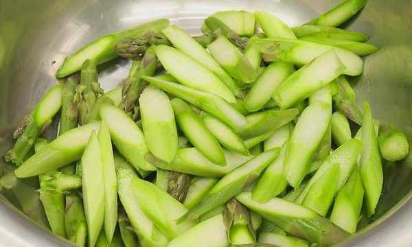 1、把芦笋后半截的皮刮一刮,皮比较粗糙,不容易消化,然后斜刀切成段,炒的时候好入味。切好以后,把上面的泥沙洗干净备用。碗中打入五个鸡蛋,加入少许的食盐和鸡粉增加底味,搅拌打散成鸡蛋液。