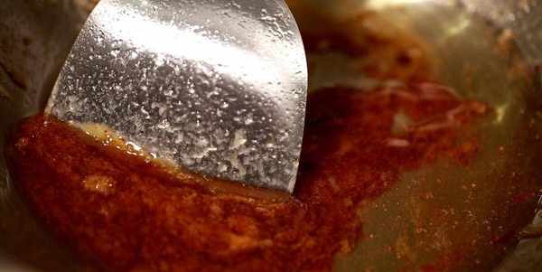 2、水炒糖色,也是要使用中小火,大火肯定是不行的,大家要切记,而且这个过程要有耐心,要不停地搅拌。