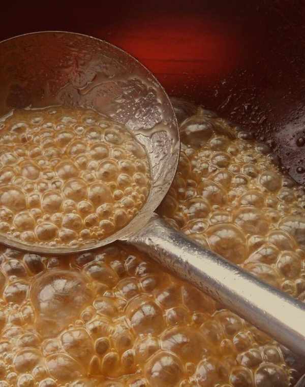3、再次出现小泡泡之后,就可以变得有些粘稠,颜色也会变得比较深,慢慢的最后变成浅棕色,小泡泡再次变回大泡泡。