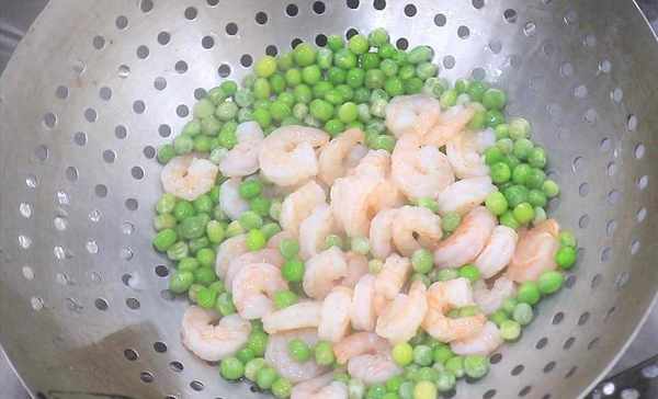 2.烧半锅开水,放入豌豆,淋入一点植物油锁住营养,汆煮1分钟左右,豌豆断生以后放入虾仁继续煮20秒钟,倒出来用清水冲洗过凉,虾仁不能久煮,不然鲜味容易流失,吃着不够嫩。