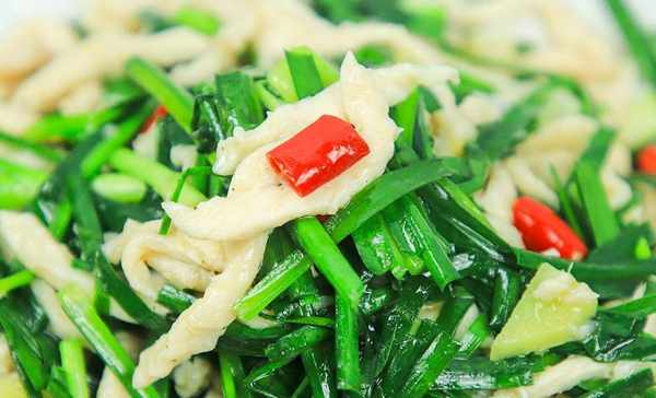 3.锅内烧油,油热以后倒入葱花姜片和小米椒炒出香味,再倒入韭菜快速翻炒,加入食盐2克、鸡粉2克、胡椒粉1克、白糖1克快速翻炒化开调料,加入鸡丝、料酒5克翻炒至韭菜断生,淋上芝麻香油翻匀,即可起锅装盘。